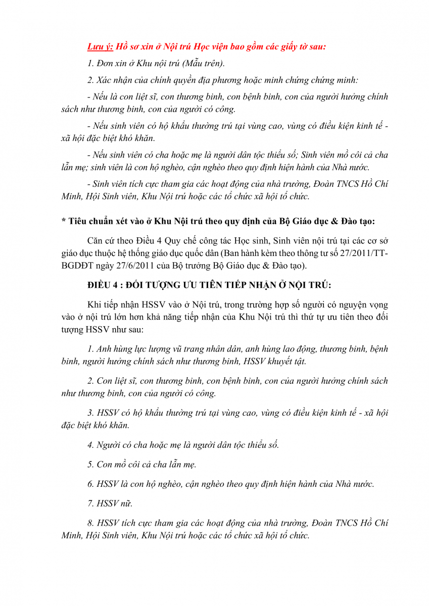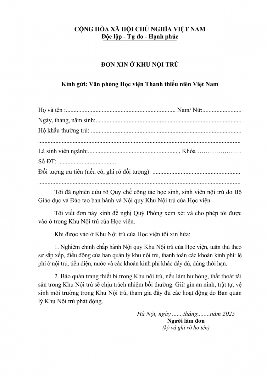 - Thông báo mẫu đơn và điều kiện ở khu nội trú của Học viện Thanh thiếu niên Việt Nam