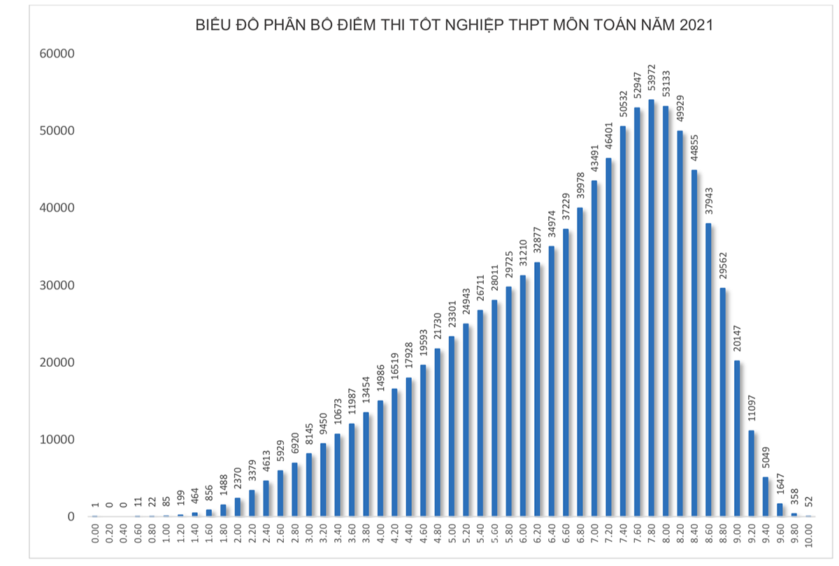 Phổ điểm thi tốt nghiệp THPT môn Toán của cả nước năm 2021 cho thấy điểm trung bình là 6,61; điểm nhiều thí sinh đạt nhất là 7-8. Trong bối cảnh các trường đại học có nhiều phương thức tuyển sinh, những em xác định xét tuyển chính bằng điểm thi tốt nghiệp THPT cần cố gắng tập trung trong giai đoạn này để đạt điểm cao, tăng khả năng cạnh tranh vào ngành học và trường yêu thích.